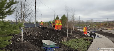 Проект подразумевал высадку широчайшего спектра видов и сортов растительности - от травянистой (газоны, многолетники) и кустарников до взрослых деревьев. Кроме декоративной растительности были высажены и культурные растения - шиповник, черника, ежевика и др. Работа велась по согласованной детальной проектной документации с привлечением сторонней геодезической службы. Геодезист давал четкие указания, где следует разместить то или иное растение. Подрощенные саженцы деревьев привозились на объект с упакованной корневой системой и с помощью грузоподъемной техники опускались в подготовленные нашими рабочими лунки.